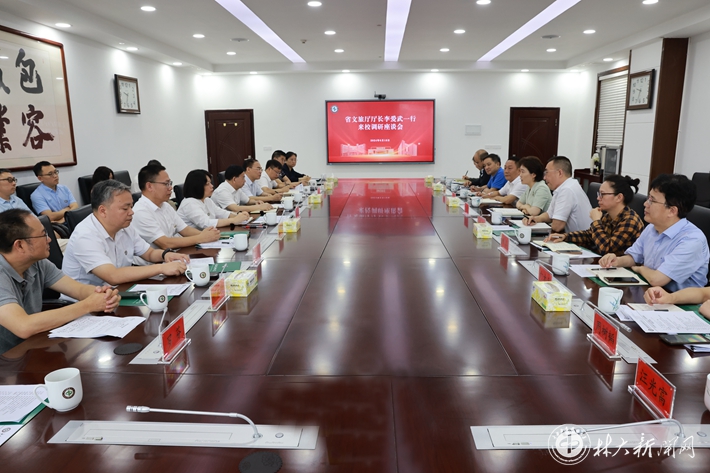 【林大网讯】(文/国家公园与旅游学院)6月18日上午,省委宣传部副部长、省文旅厅党组书记、厅长李爱武,省文物局局长姜猛,省文旅厅二级巡视员王鹏一行来校调研,听取有关专家对湖南文旅发展、湖南文旅“十五五”规划的建议,共商厅校合作交流。校党委副书记、校长仇怡,纪委书记、监察专员杨鑫铨,党委副书记王忠伟,副校长尹健出席交流座谈会。