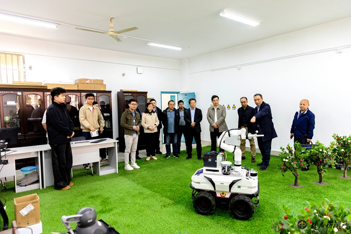▲省林业局副局长胡锋一行参观林果采摘机器人实验室