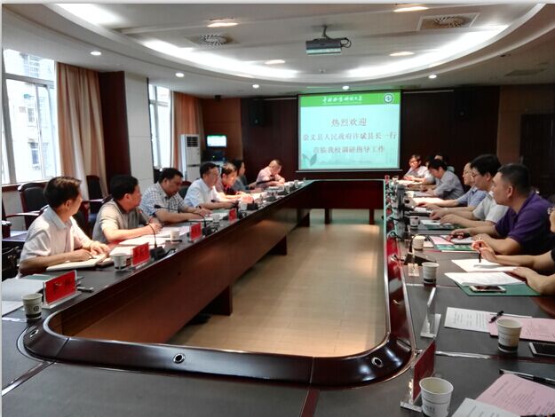 6月15日下午,崇义县县长许斌、县委副书记、副县长王明良、县林业局局长罗福生等一行九人,前来我校开展“校地”产学研合作座谈交流。副校长赵运林、吴义强接待了许斌一行。科学技术处、旅游学院、材料科学与工程学院等单位负责人以及有关学科的11名教授参加了交流座谈会。