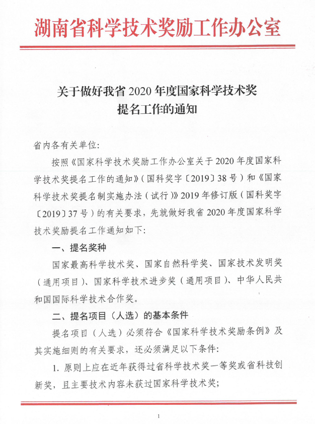 根据省科技厅奖励办《关于做好2020年度国家科技奖励提名工作的通知》的要求,我校现开展相关提名项目的推荐工作。