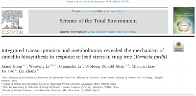 近日,环境科学TOP期刊《Science of The Total Environment》(中科院一区,IF: 9.8)在线发表了经济林创新团队题为“Integrated transcriptomics and metabolomics revealed the mechanism of catechin biosynthesis in response to lead stress in tung tree (Vernicia fordii)”的研究论文。文章报道了油桐响应铅胁迫的新的分子机制。