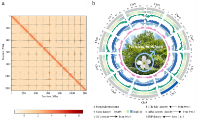 研究利用PacBio和Hi-C技术得到一套高质量染色体水平的千年桐雄树参考基因组,基因组大小为1.29 Gb,contig N50为3.69 Mb,97.28%的序列锚定到11条染色体上。